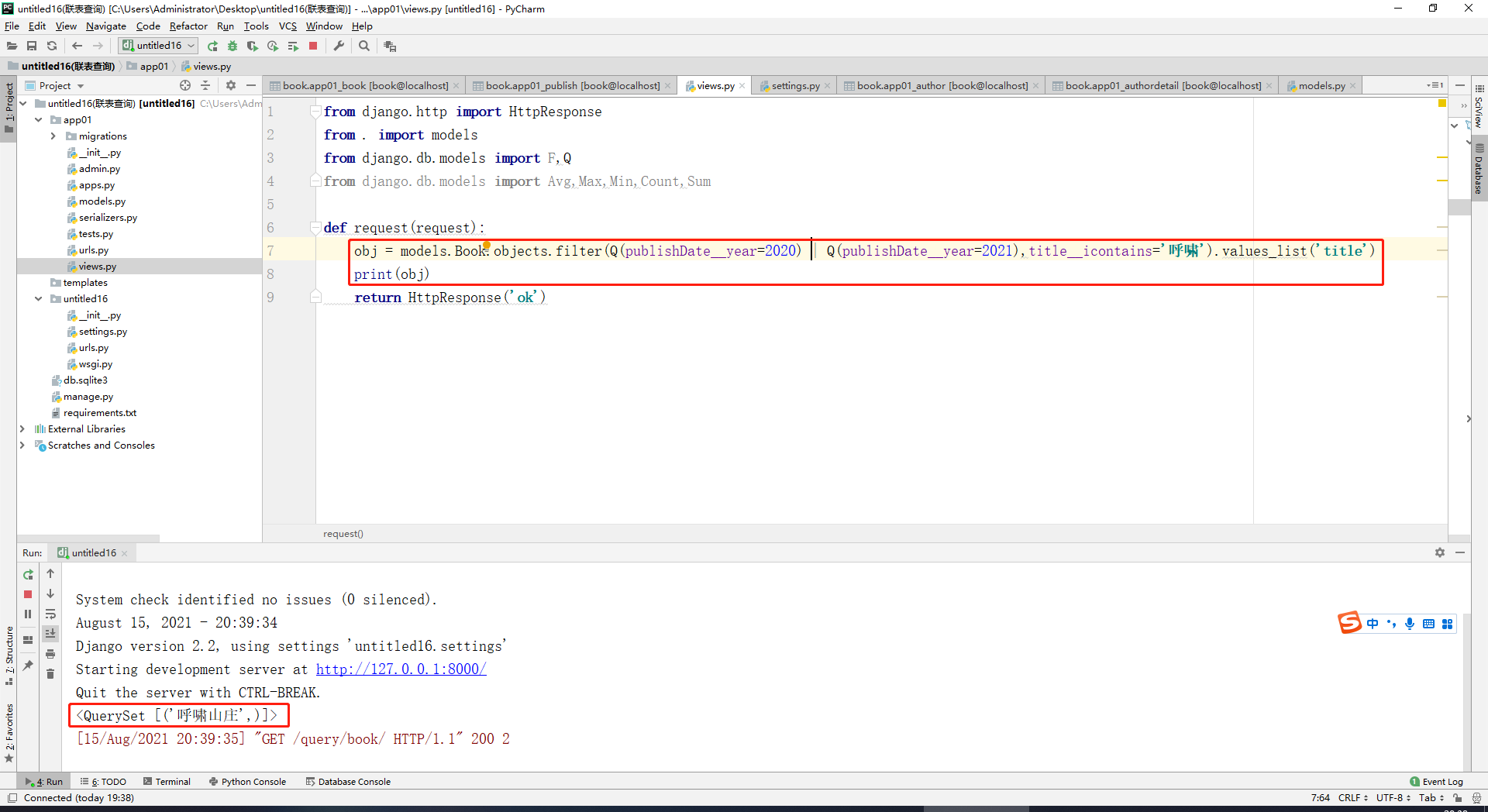 查询出版日期是2020年或者2021年,然后书籍名称包含呼啸的图书,逗号是and的意思