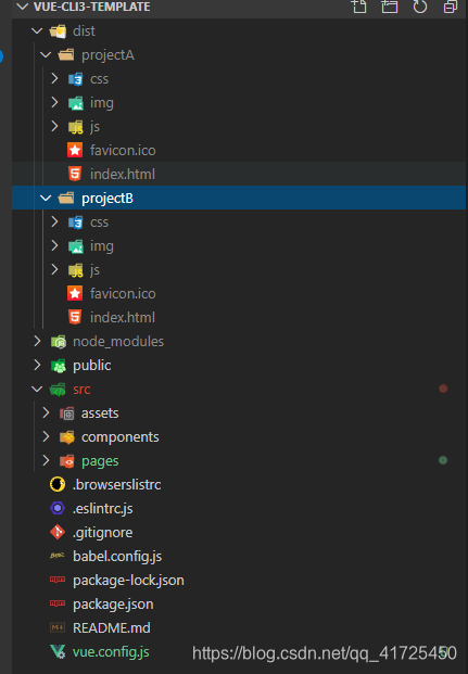 但是这个时候打包会有问题,执行npm run build进行编译打包,打包结果两个不同的项目的文件各自编译打包,但并没有按项目分成不同的文件夹放置,这不是我们希望的,接下来我们对vue.config.js做以下修改: