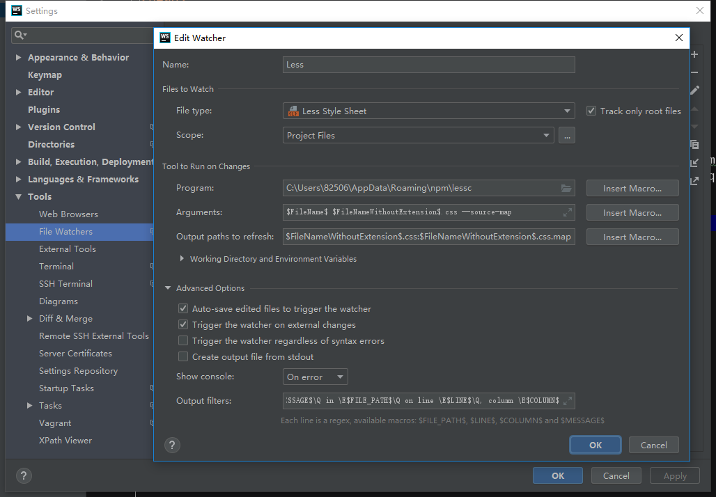 打开webstorm, File——Settings——Tools——File Watchers——点击 加号——选择less