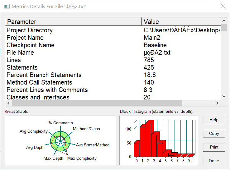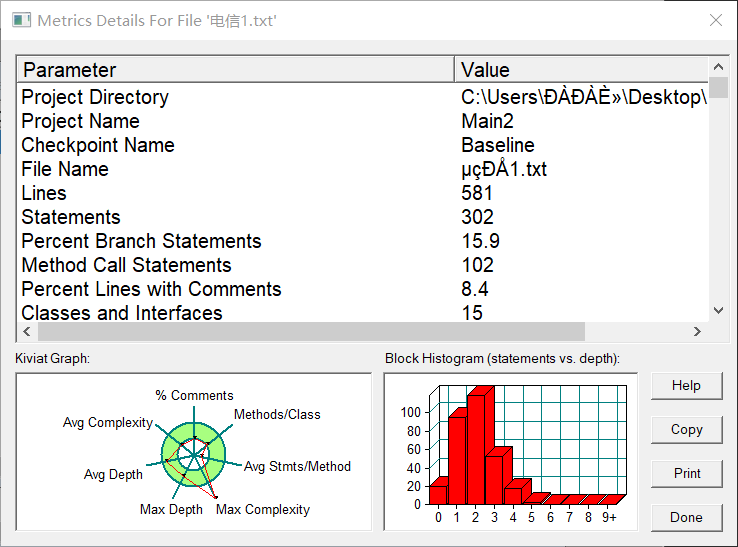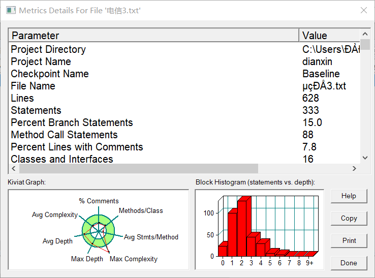 分析:电信1的得分点最后还有一个没有过,但测试了很多输入样例都没有测出来。由上图可知,最后的代码平均深度,平均复杂度和最大深度差不多,不是很高,最大复杂度比较高,信息量实在是太多了,不过总体来说圈复杂度还是可以的。注释我都做了类的注释,但好像还是有点少了。