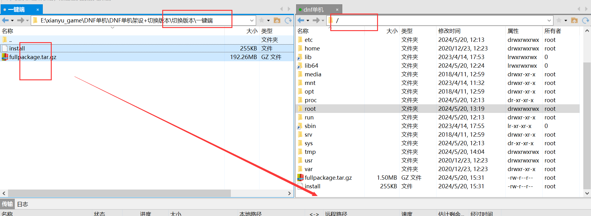 用xftp上传 一键端 文件到虚拟机 根目录 / :