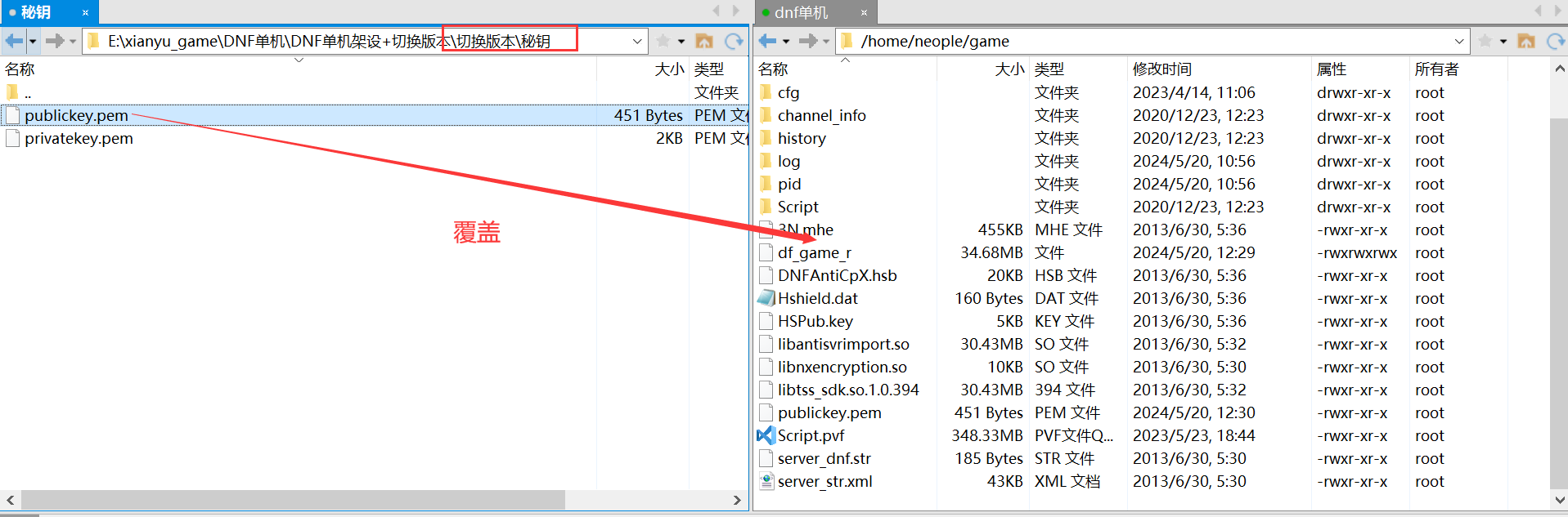 上传密钥文件到/home/neople/game/ 覆盖