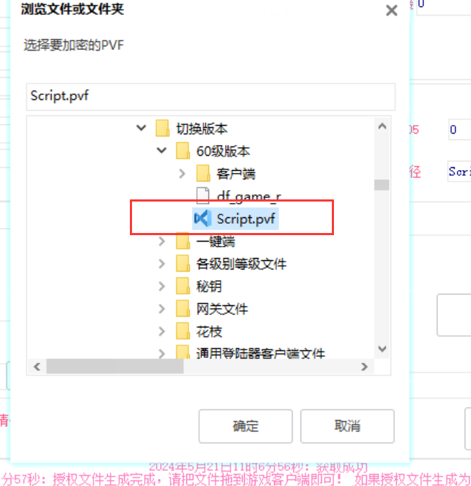 确定,等待进度100%,在弹框出来点击确定,会打开一个新的文件对话框,输出了加密的pvf,我们复制下这个文件