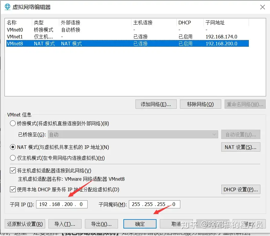 再次选择 VMnet8 ,子网ip改成 192.168.200.0 然后点击确定。