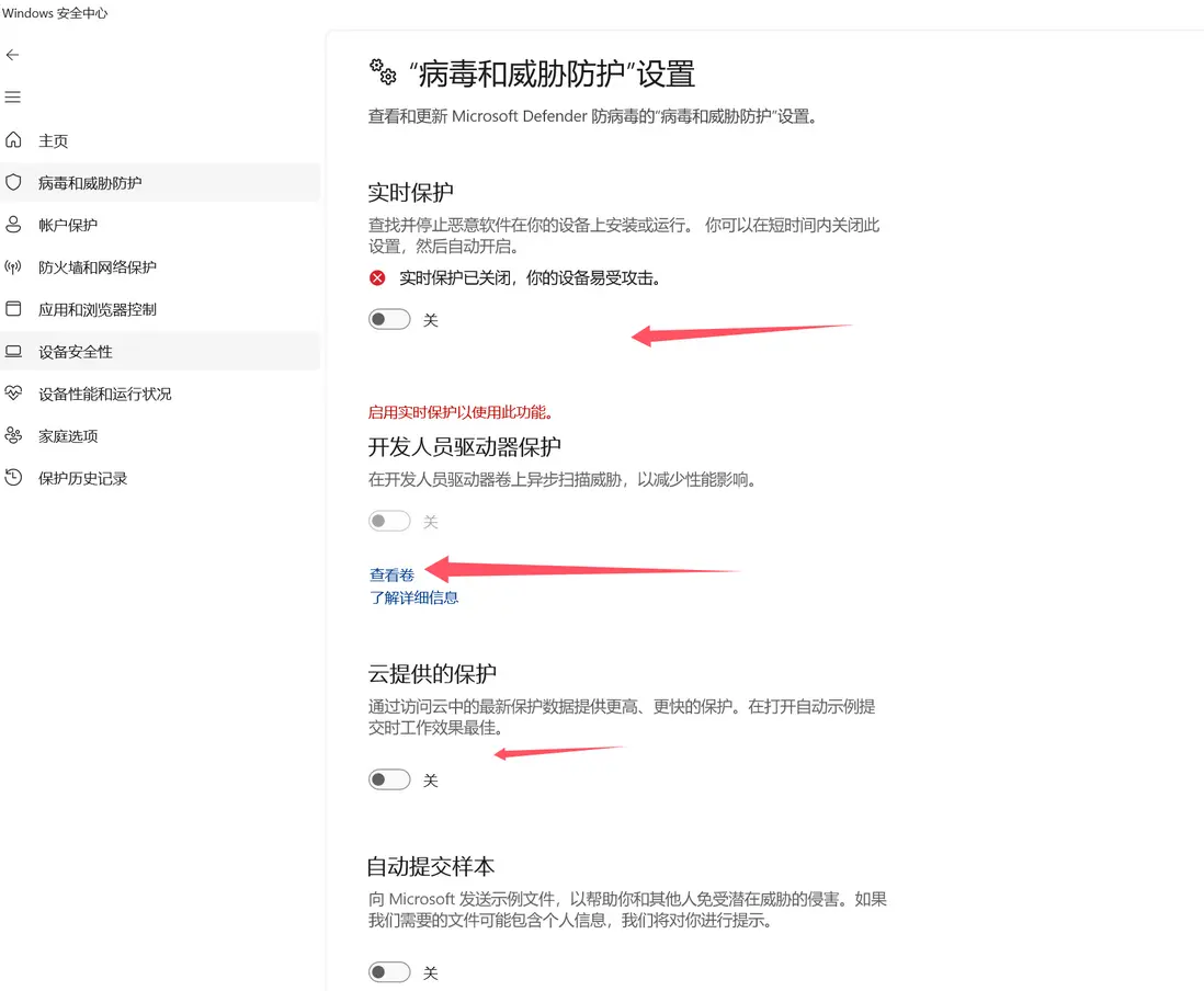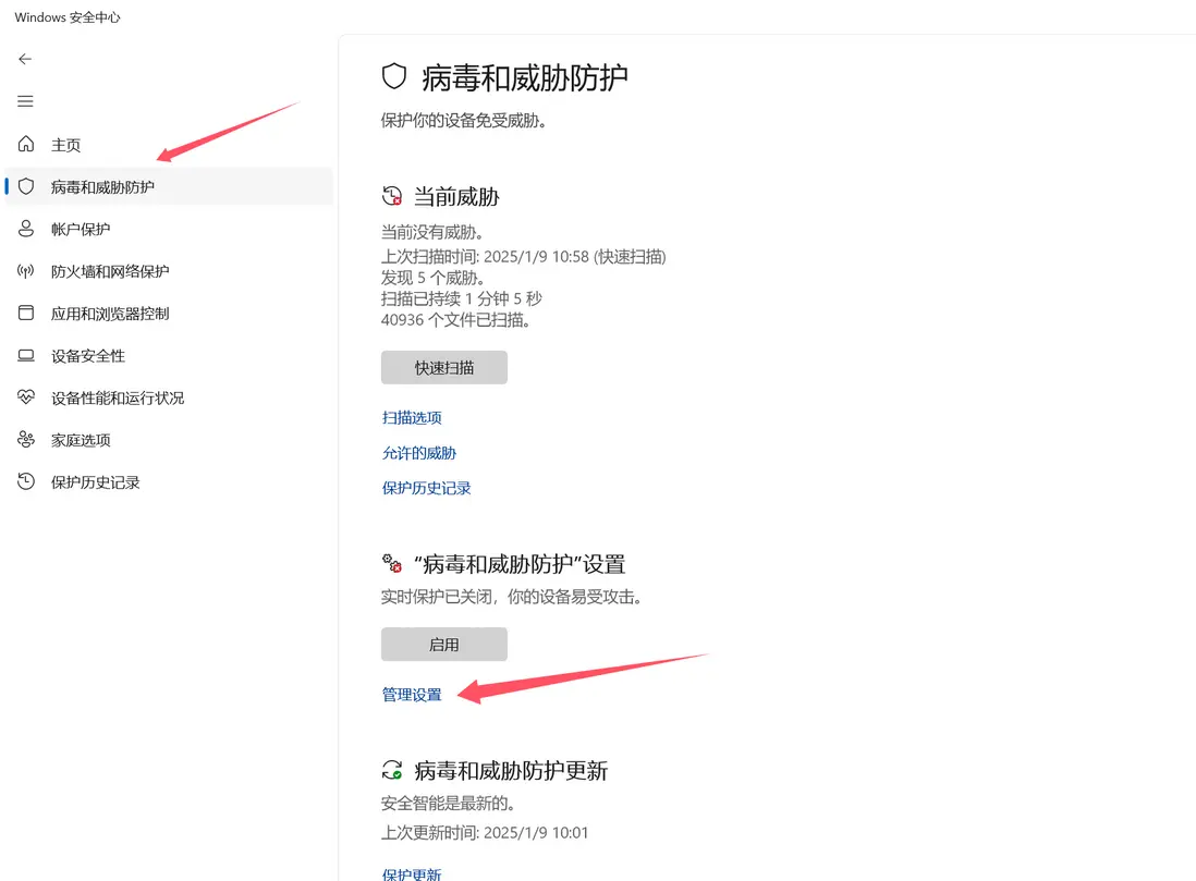 关闭默认杀毒软件和其它自己下的杀毒软件 ,一定要检查关闭!!!! 打开windows的安全中心 ,点击管理设置