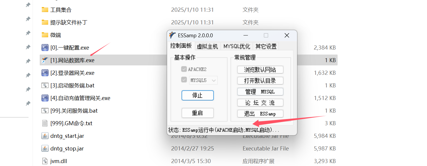 右键管理员方式启动 打开 [1].网站数据库.exe ,打开后 点击启动 正确下方显示(APACHE启动;MYSQL启动) , 一定要管理员方式启动!!!