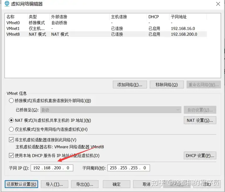 虚拟机安装好后,首先打开虚拟机,左上角编辑->虚拟网络编辑器, 选择VMnet8 ,下面更改设置, 然后在选择VMnet8 ,修改成下面设置192.168.200.0,确定