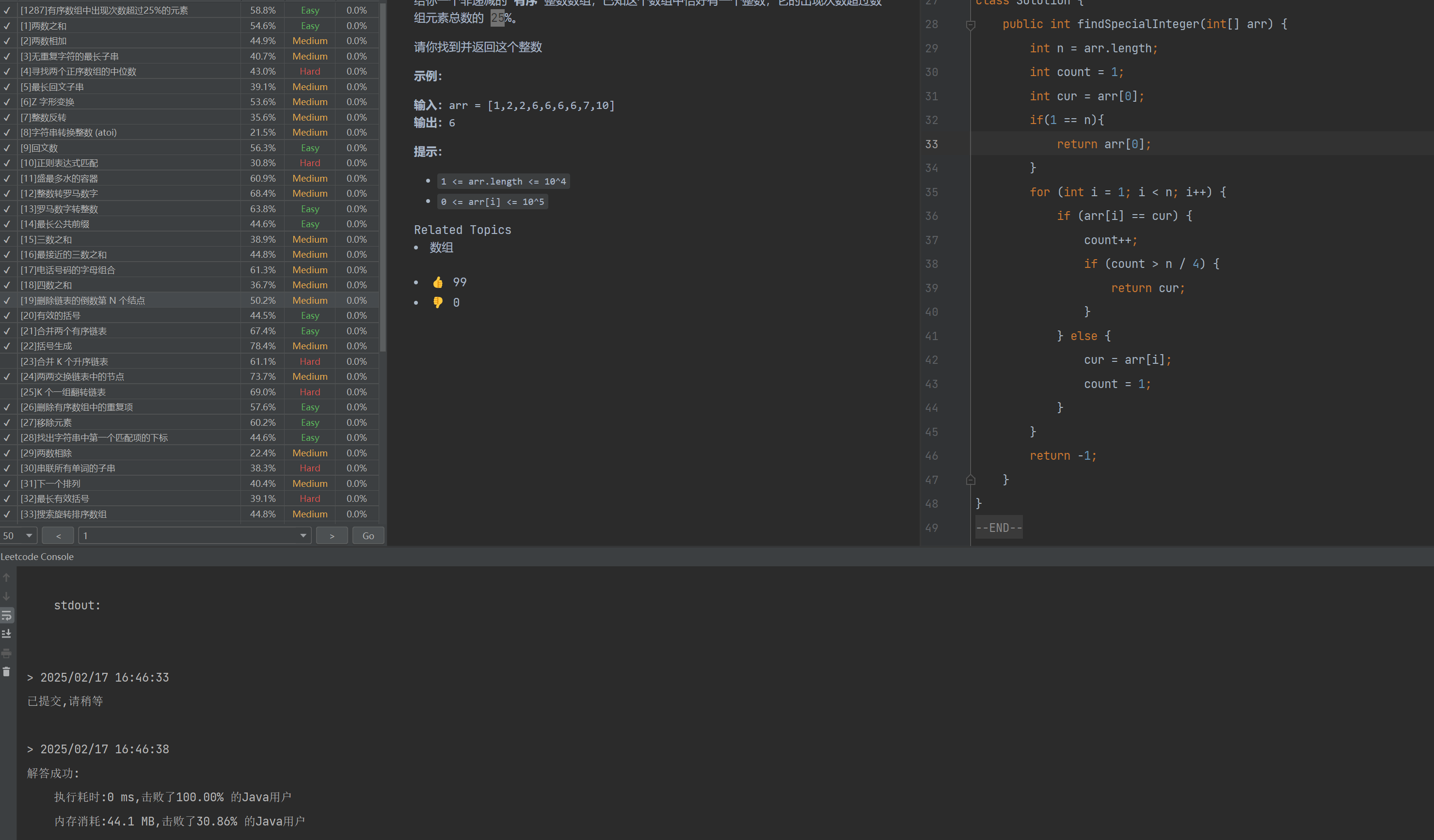 给你一个非递减的 有序 整数数组,已知这个数组中恰好有一个整数,它的出现次数超过数组元素总数的 25%。