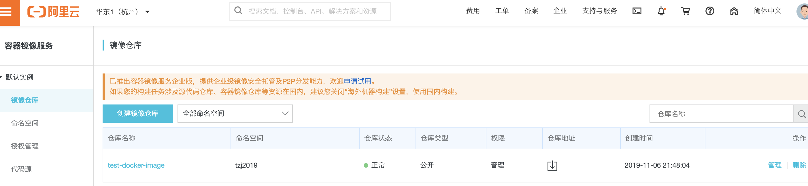 //拷贝文件 cp /Users/XXX/XX/2019/01.Docker/dockerfile-demo/target/dockerfile-demo-0.0.1-SNAPSHOT.jar /usr/local/bin/first-dockerfile //登录 XXX$ sudo docker login --username=阿里云账号 registry.cn-hangzhou.aliyuncs.com(采坑:换行多了空格会引起报错) //打个tag sudo docker tag test-docker-image registry.cn-hangzhou.aliyuncs.com/tzj2019/test-docker-image:v1.0 //推送到阿里云 sudo docker push registry.cn-hangzhou.aliyuncs.com/tzj2019/test-docker-image:v1.0