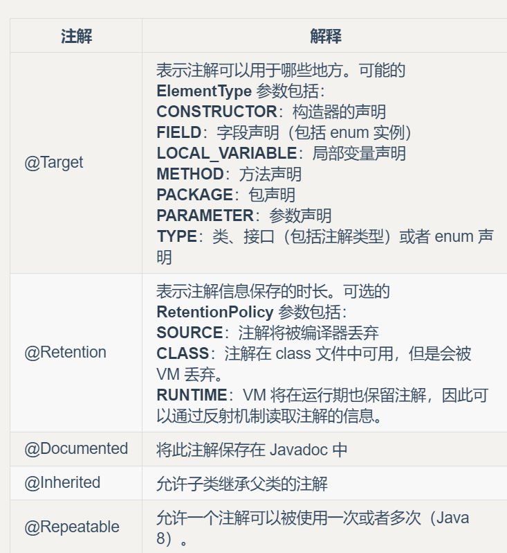 SOURCE:在源文件中有效(即源文件保留) CLASS:在 class 文件中有效(即 class 保留) RUNTIME:在运行时有效(即运行时保留) ############################# 生命周期大小排序为 SOURCE < CLASS < RUNTIME,前者能使用的地方后者一定也能使用。
