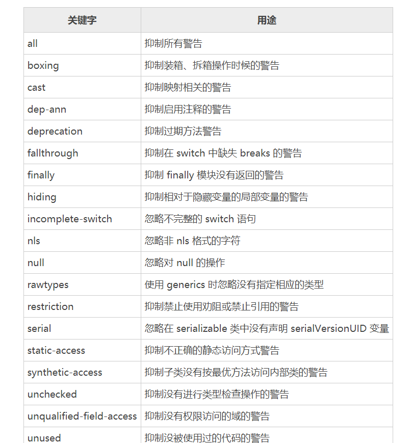 被该注解修饰的程序元素(以及该程序元素中的所有子元素)取消显示指定的编译器警告,且会一直作用于该程序元素的所有子元素