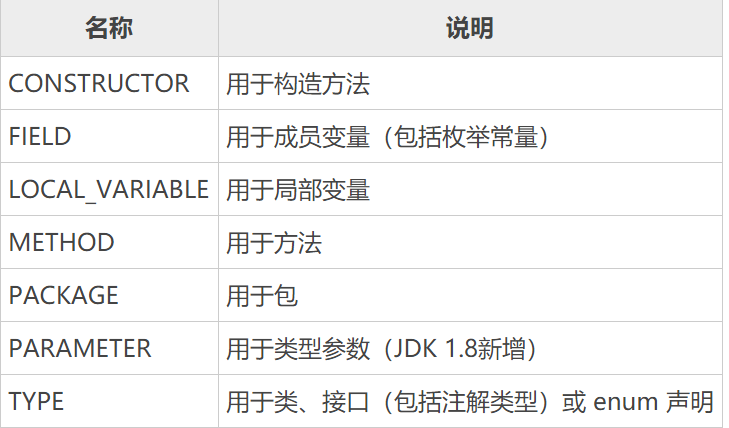 指定一个注解的使用范围,即被 @Target 修饰的注解可以用在什么地方。@Target 注解有一个成员变量(value)用来设置适用目标,value 是 java.lang.annotation.ElementType 枚举类型的数组