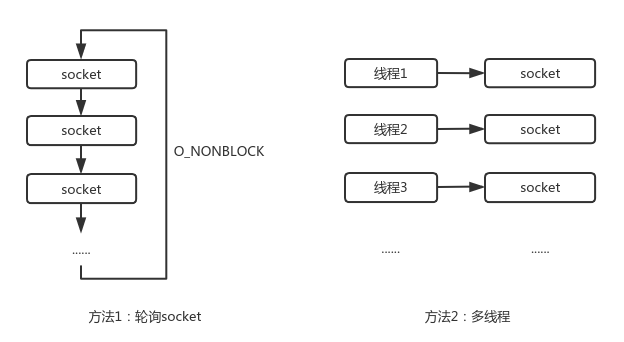 多路复用是怎么一回事呢?我们假设一下有100个socket,在某一时间可能只有个别socket是有数据的,即客户端向服务端发送的请求数据。此时服务程序怎么监控这100个socket,找出有数据的socket,并做出响应?有一种做法,就是非阻塞读每个socket,没数据直接返回读下一个,有数据(请求)就响应,以此实现轮询。还有一种做法,创建100个进程/线程,每个线程,进程对应一个socket。