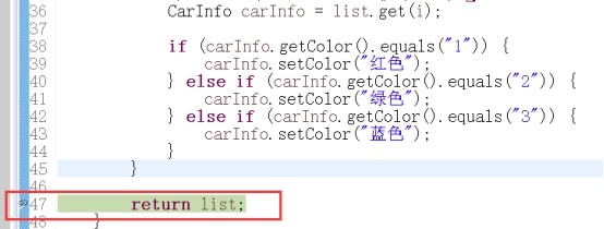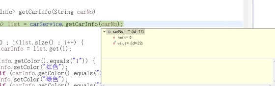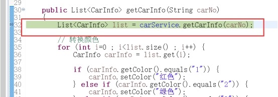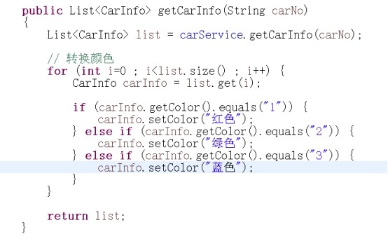 流程就是通过Service取出符合规则的车辆信息,如果参数carNo不为空,取出的列表只有一条,如果为空,取出所有的车辆信息。并且将车辆颜色标识做一个转换,1为红色,2为绿色,3为蓝色。
