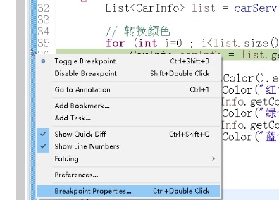 我们先将断点设置在for循环任意的位置,然后鼠标右键点击断点弹出菜单。选择【Breakpoint Properties】,