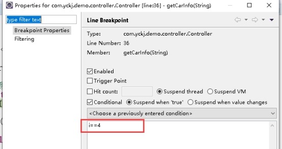在这里选择【Conditional】,下面填上条件就可以了。这里我设置的i==4,表示执行4此后停住。扩展一下,这里还可以使用||, &&进行条件组合。