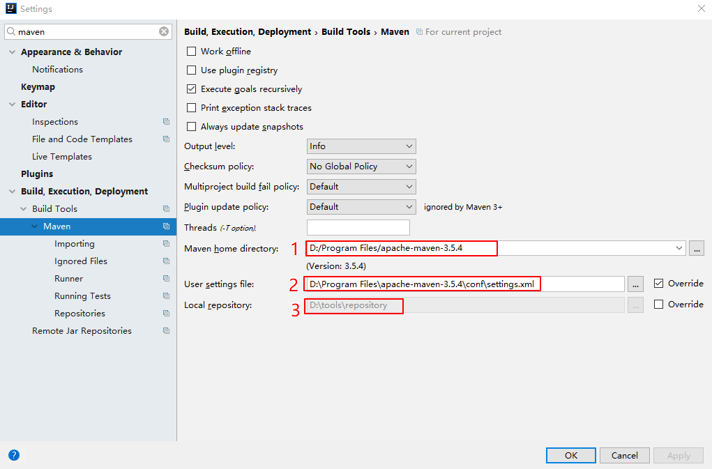 2:勾选Override,修改为自己目录下的settings.xml目录