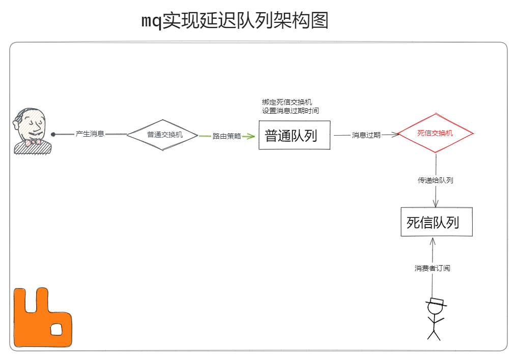 生产者-->交换机01-->过期队列-->消息过期后-->死信交换机-->死行队列-->消费者