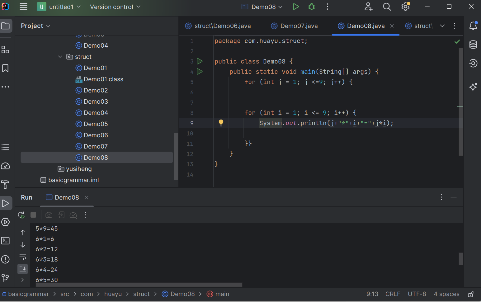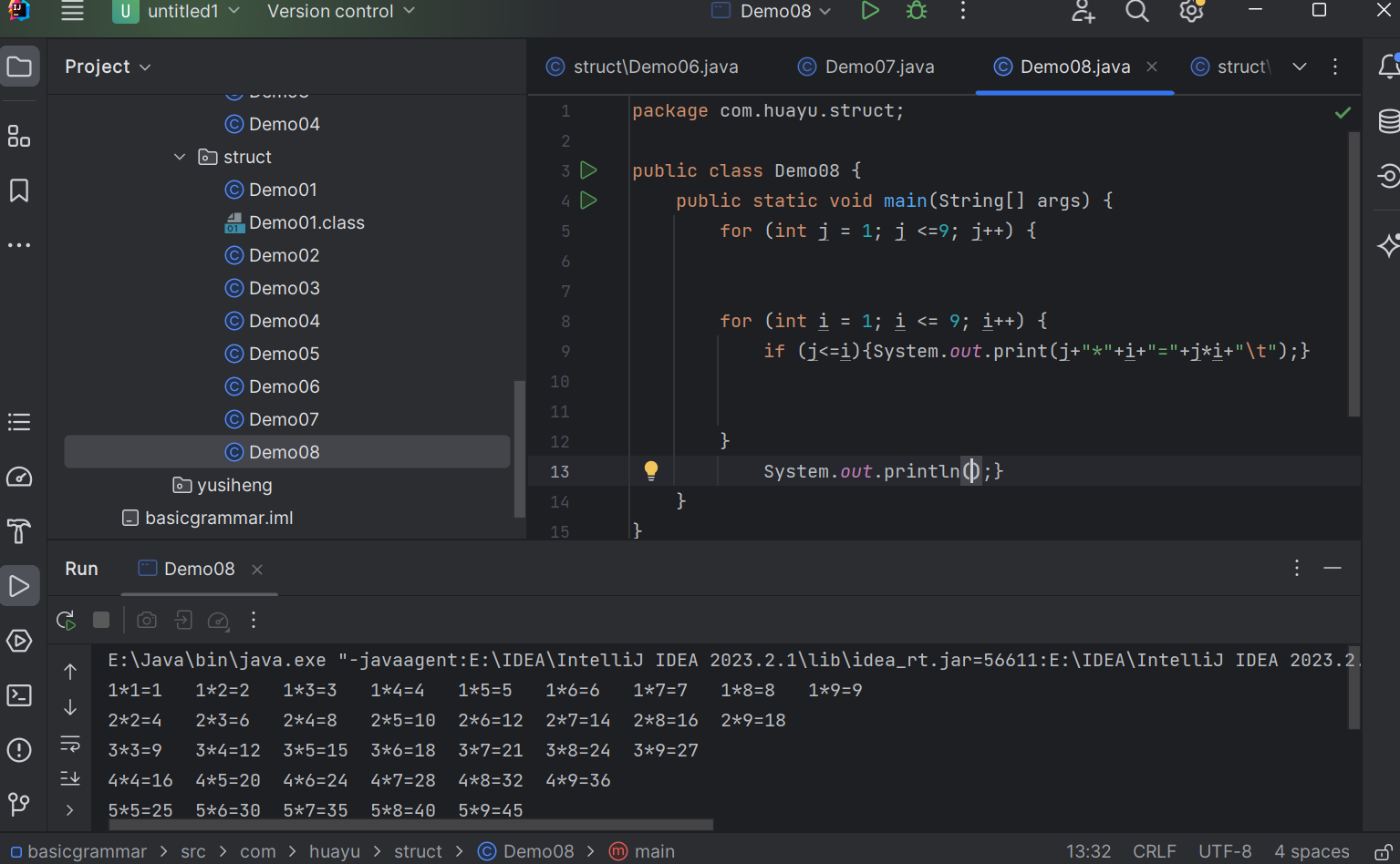 我们得到9*9的所有数字,但是九九乘法表不记录重复算数,所以我们要去除重复数字,我们可以通过输入条件让i永远小于等于j,那么就不会出现重复数字了
