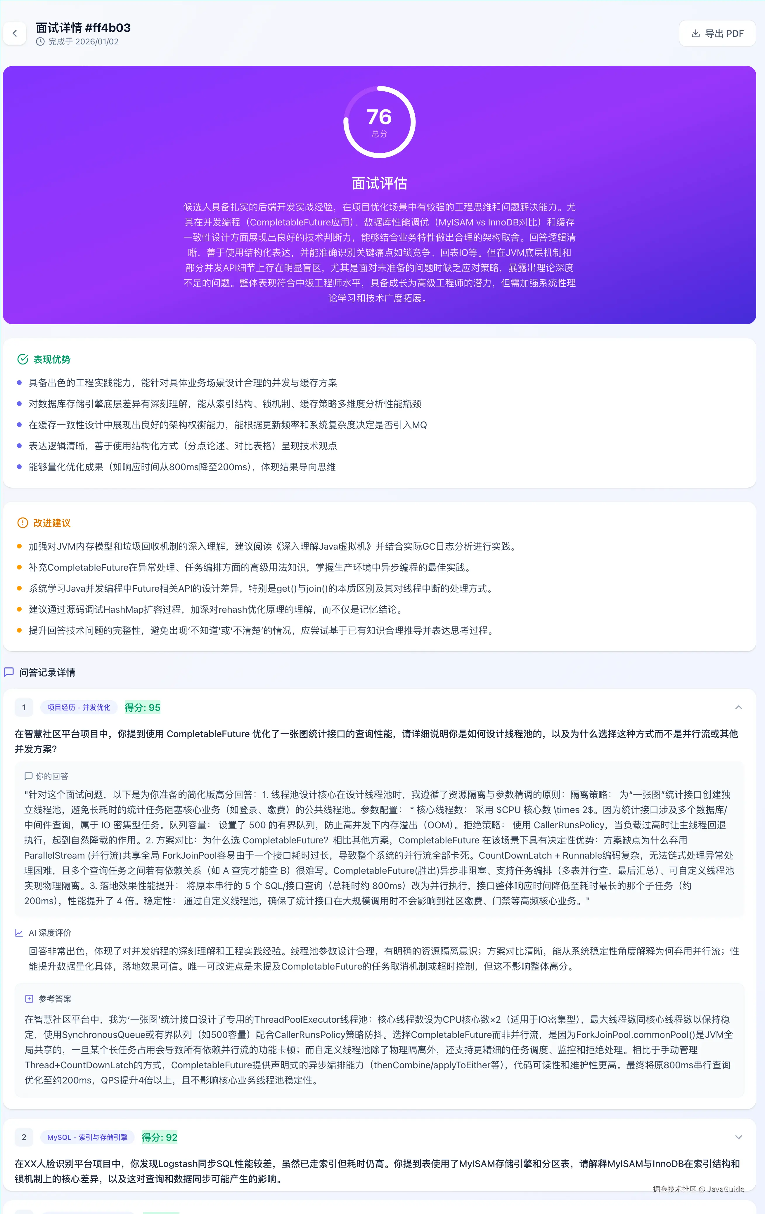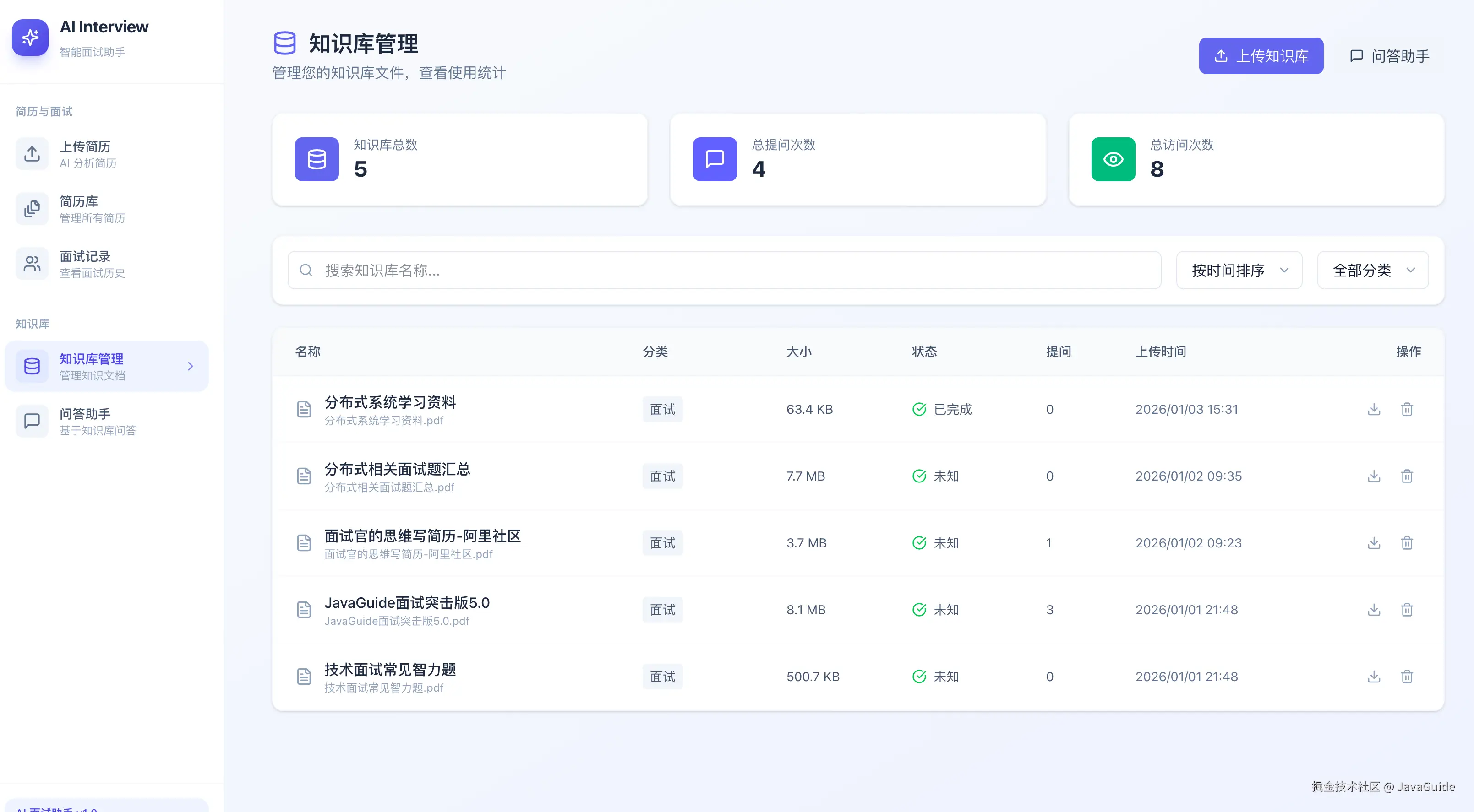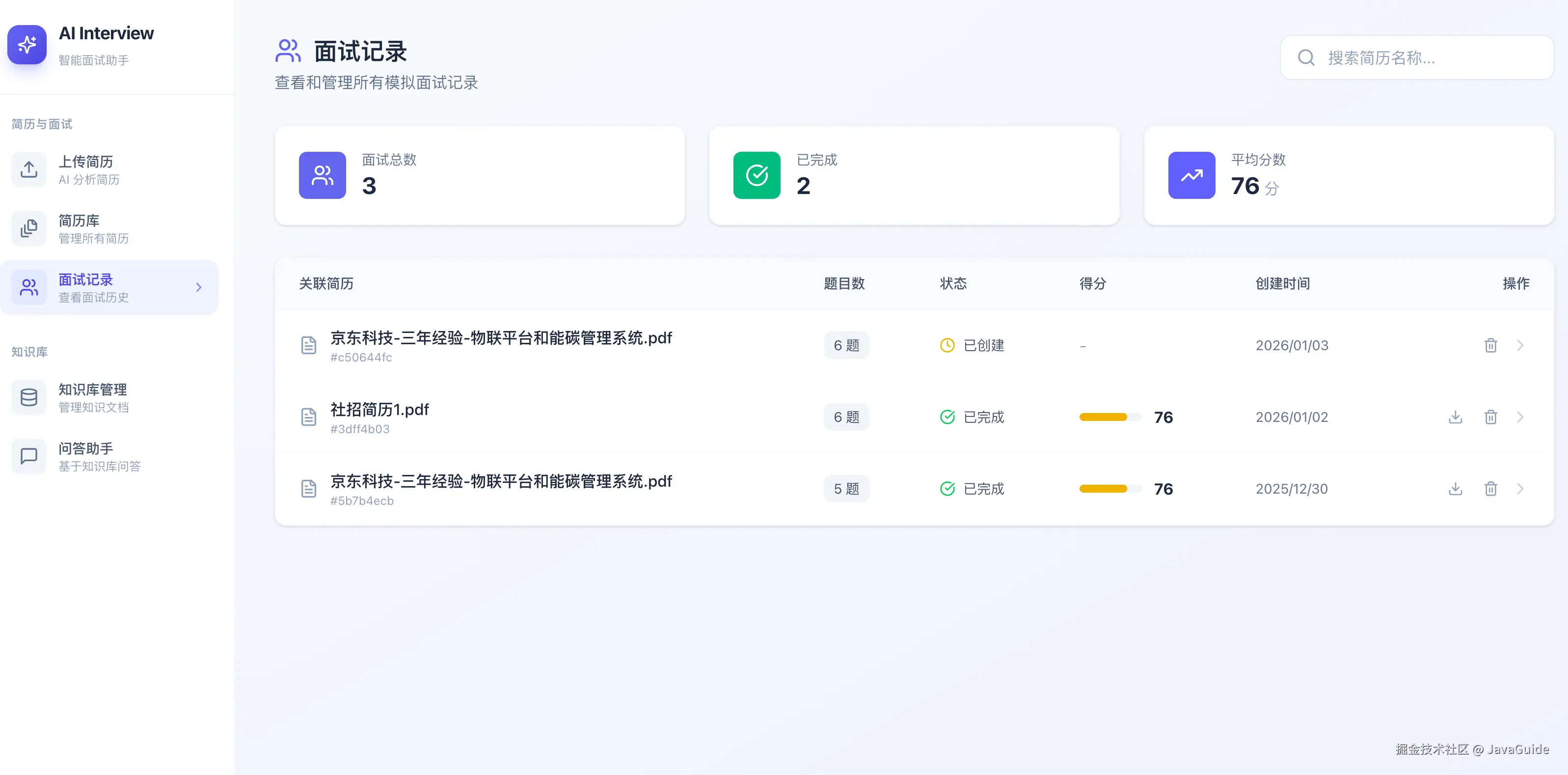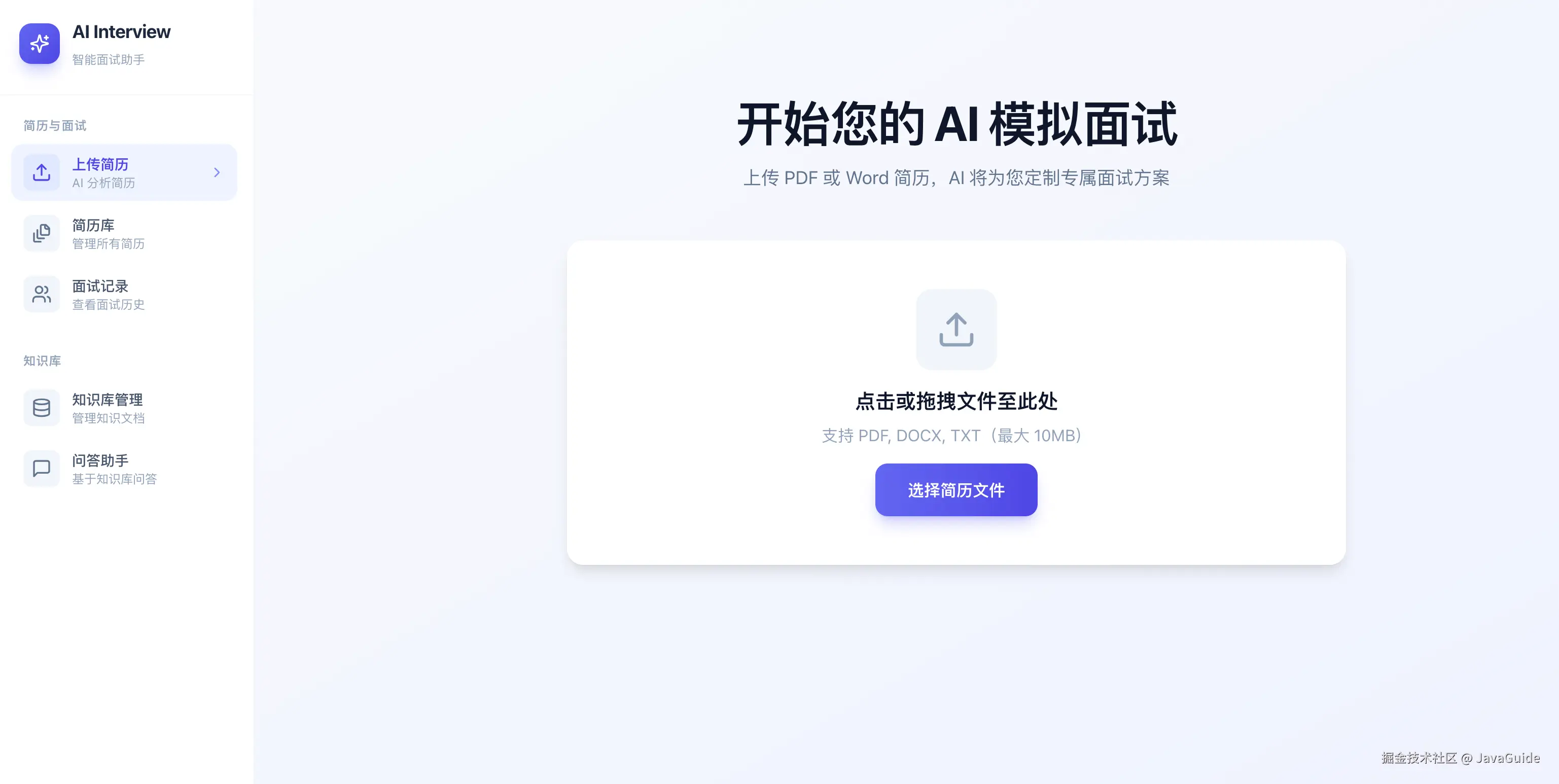 - 模拟面试系统:基于简历内容生成个性化面试题,支持实时问答和答案评估