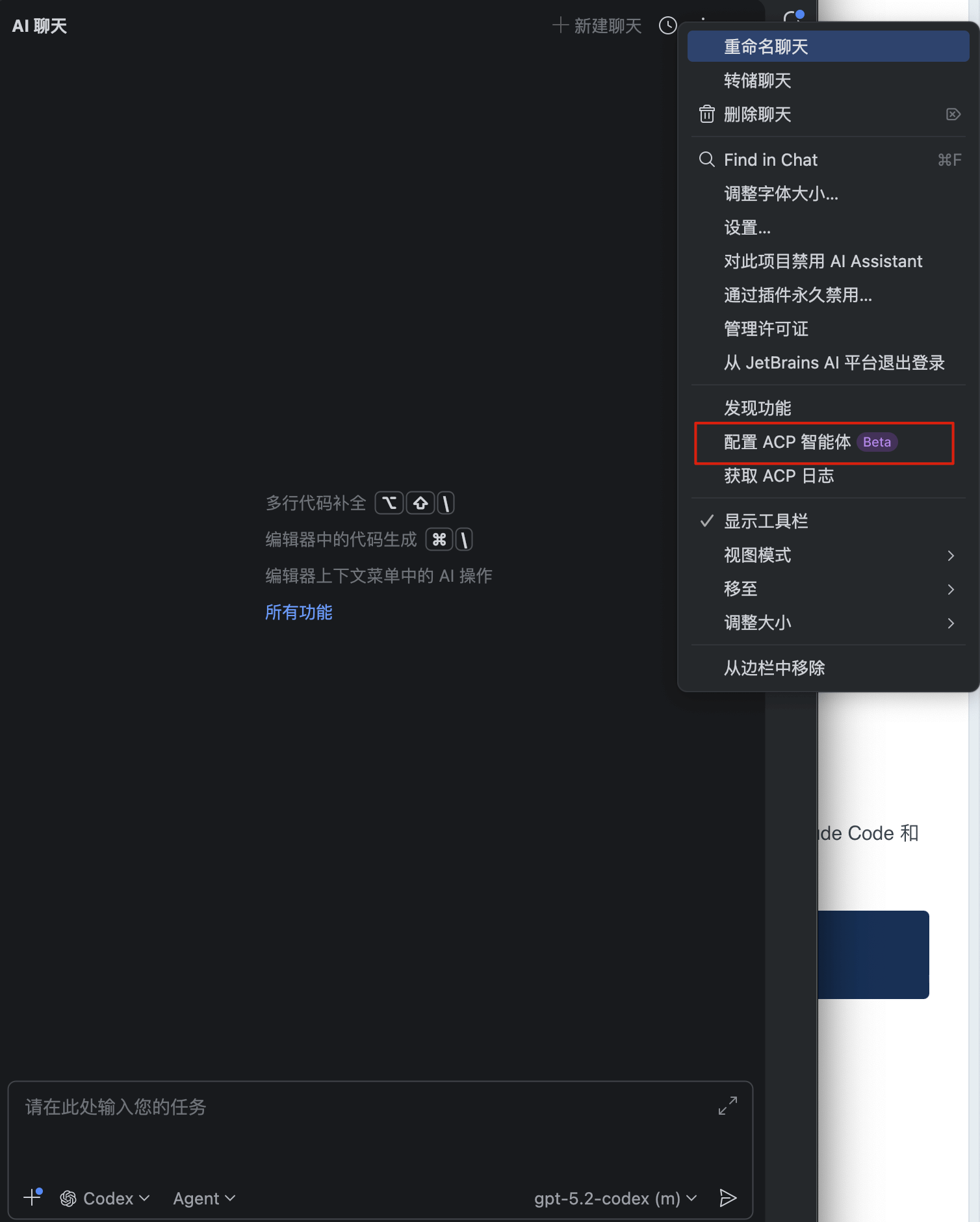 打开 AI Assistant 的聊天面板,点击右上角选择下拉框,你会看到 「配置 ACP 智能体」 选项。