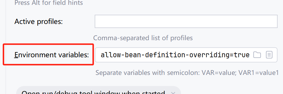 报错提示如上注册错误,说明有相同的 bean的名称,因此在 启动springboot时,增加如下设置,点击 edit,增加如下信息