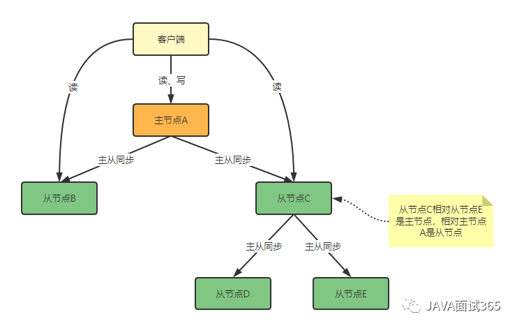 上述结构的好处是主节点A不再需要同步给从节点D,E由从节点C分担了主节点A的压力,从而保证主节点A的性能。