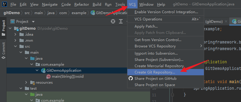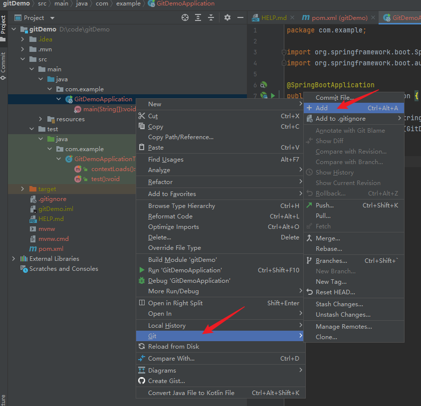 用idea完成git初始化操作,这就相当于git init命令,此时项目的所有文件将变为红色,红色代表:未add的文件