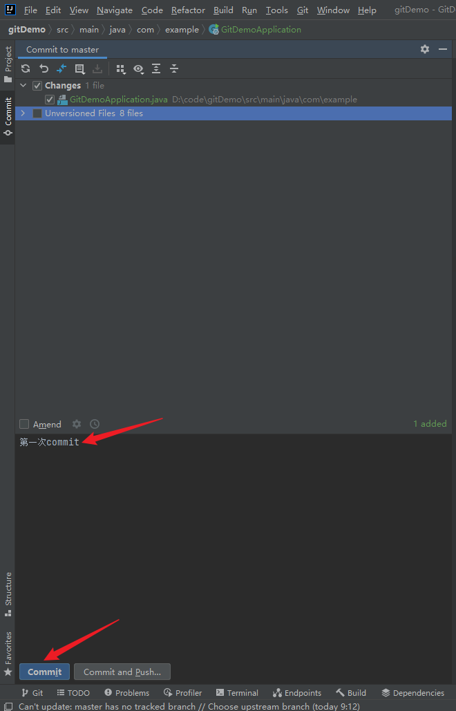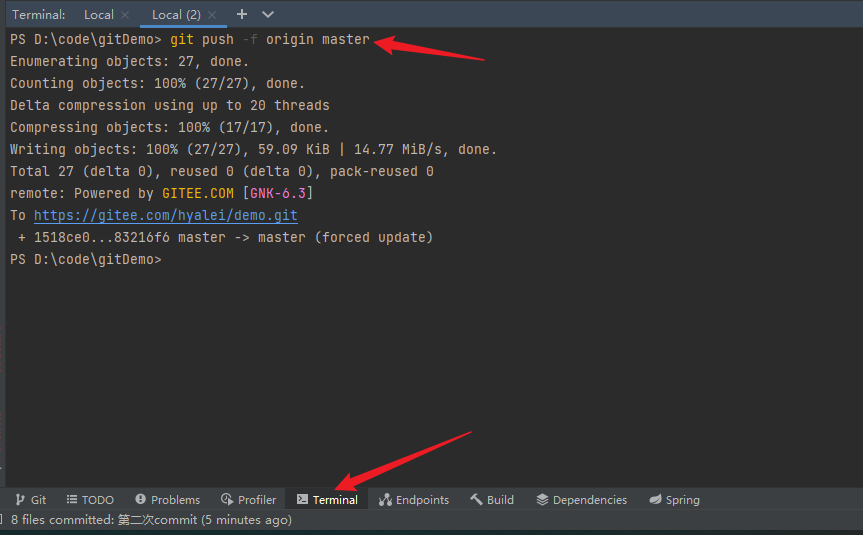 第一次提交需要用强制提交命令,打开terminal,输入git push -f origin master