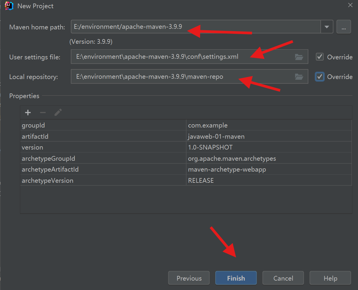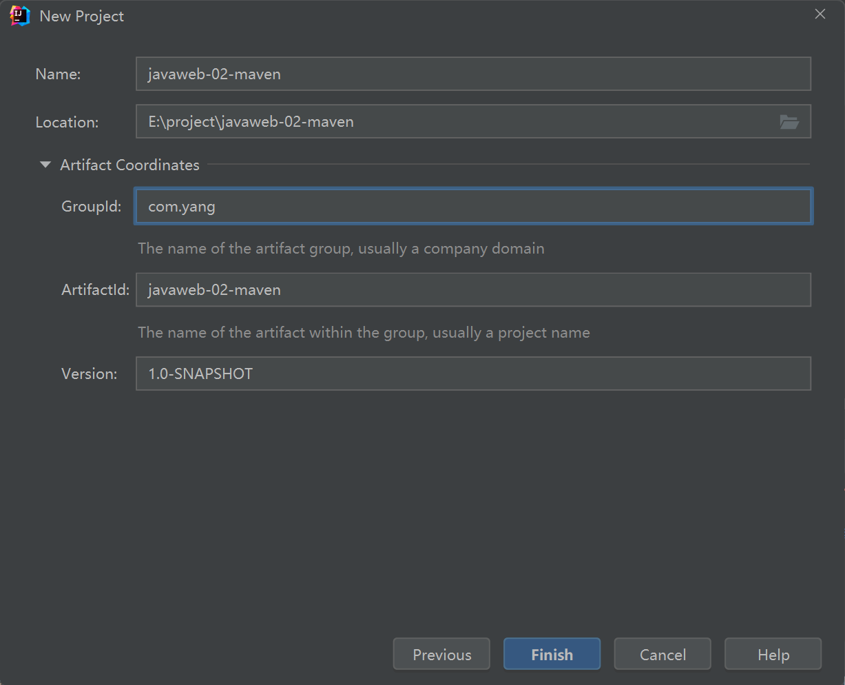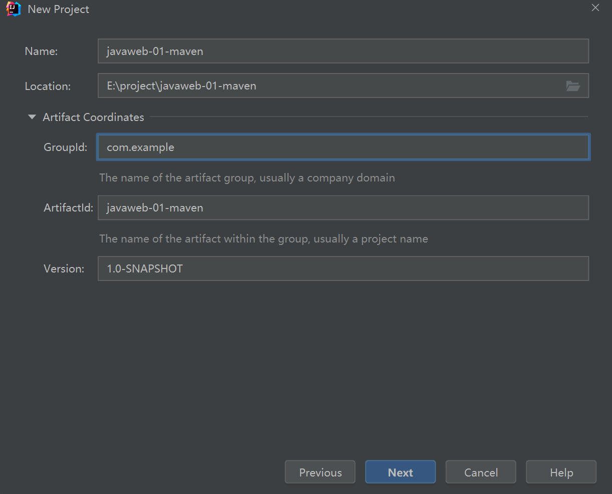 - Groupid(组id)填写 com.example ,Atifactid(项目名)填写 javaweb-01-maven 。