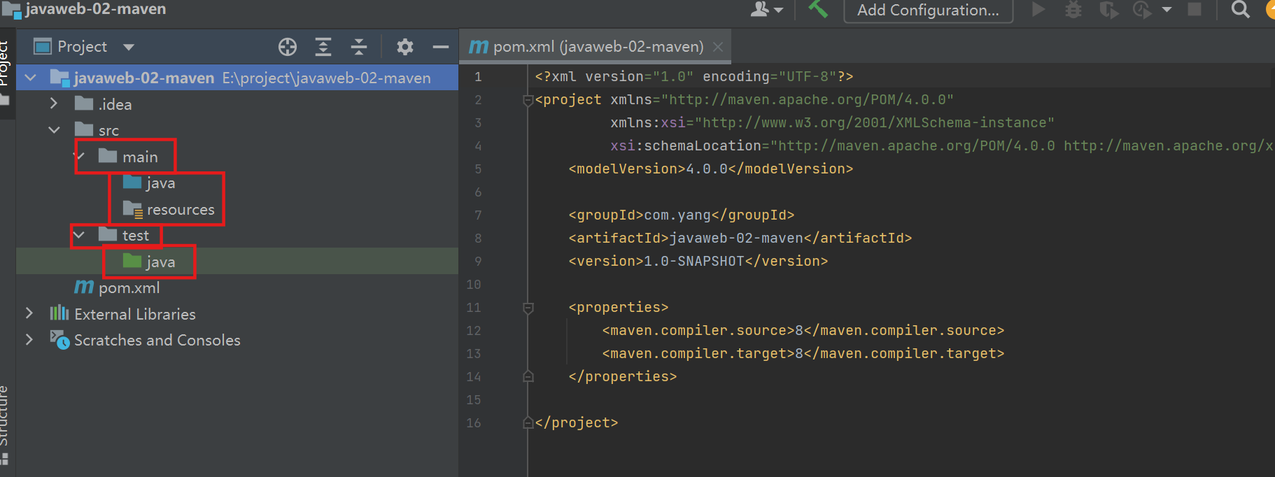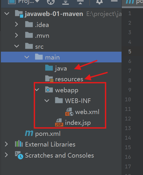 - 上面5个步骤结束,目录还不够完整。需要在main下添加两个文件夹java,resources(方框里面是网站,目录只有web应用才会出现)
