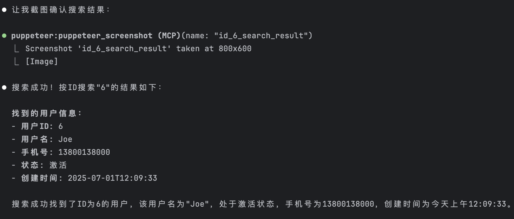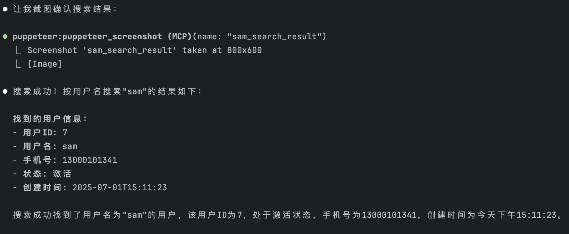 使用这个 MCP 工具,它会自动安装 Puppeteer 用的测试 Chrome 浏览器,然后自动填充参数,自动查询,自动截图,然后返回搜索结果。