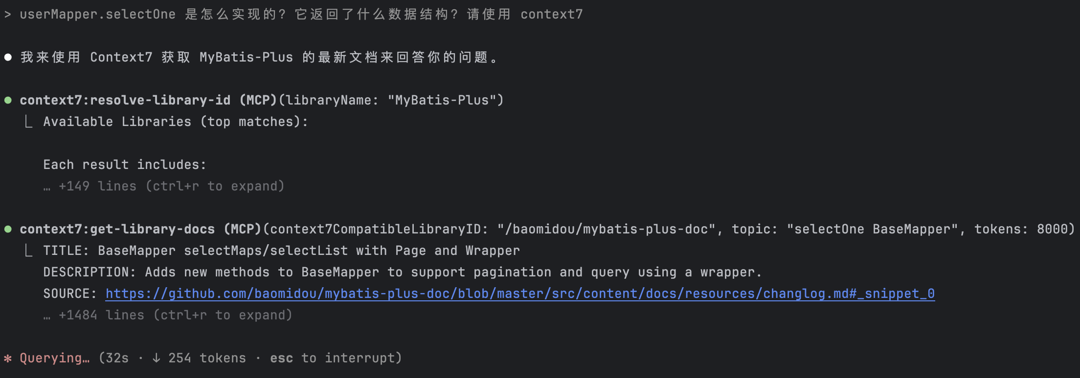 如图,它会告诉你使用 Context7 相关工具来获取 MyBatis-Plus 的最新文档来回答问题。