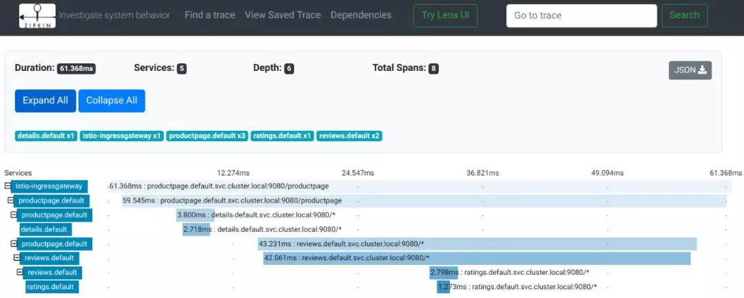 我们用一个Istio文档里的链路跟踪例子来看看效果: