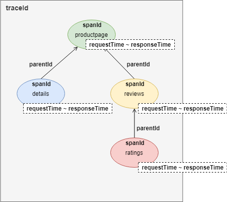 从图中可以看到,这是一个用户访问productpage页面的请求。在请求过程中,productpage服务顺序调用了details和reviews服务的接口。而reviews服务在响应过程中又调用了ratings的接口。