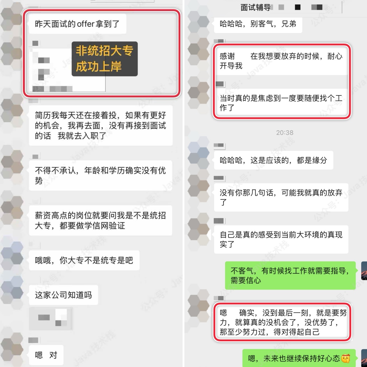 小甲还是非统招大专,空窗大半年没有 offer,中途差点放弃,通过我们的面试辅导,成功拿到一个还不错的 Offer,实现了弯道超车,感悟非常深刻。