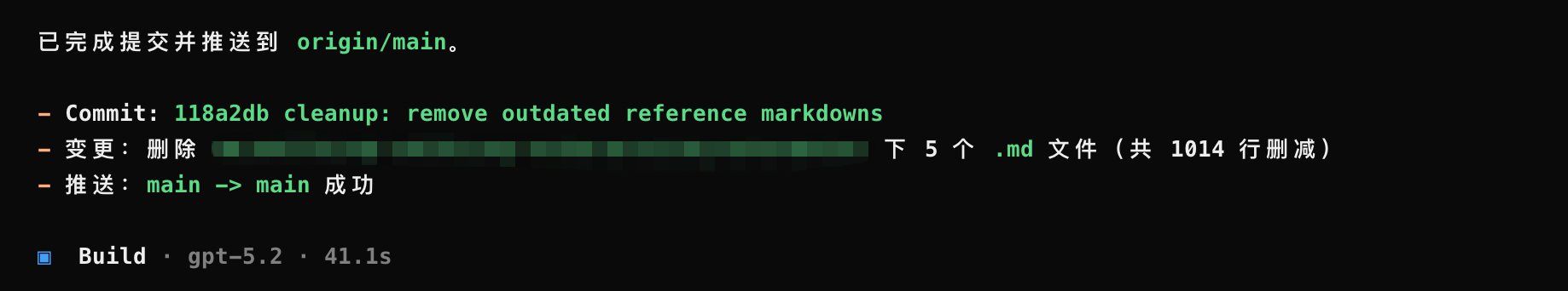 一句话就提交代码了,都不用自己想提交说明了,提交说明是和当前的变更文件是一致的,但是提交说明是英文的,有需要可以自己修改下 Skill 代码来实现中文提交说明。