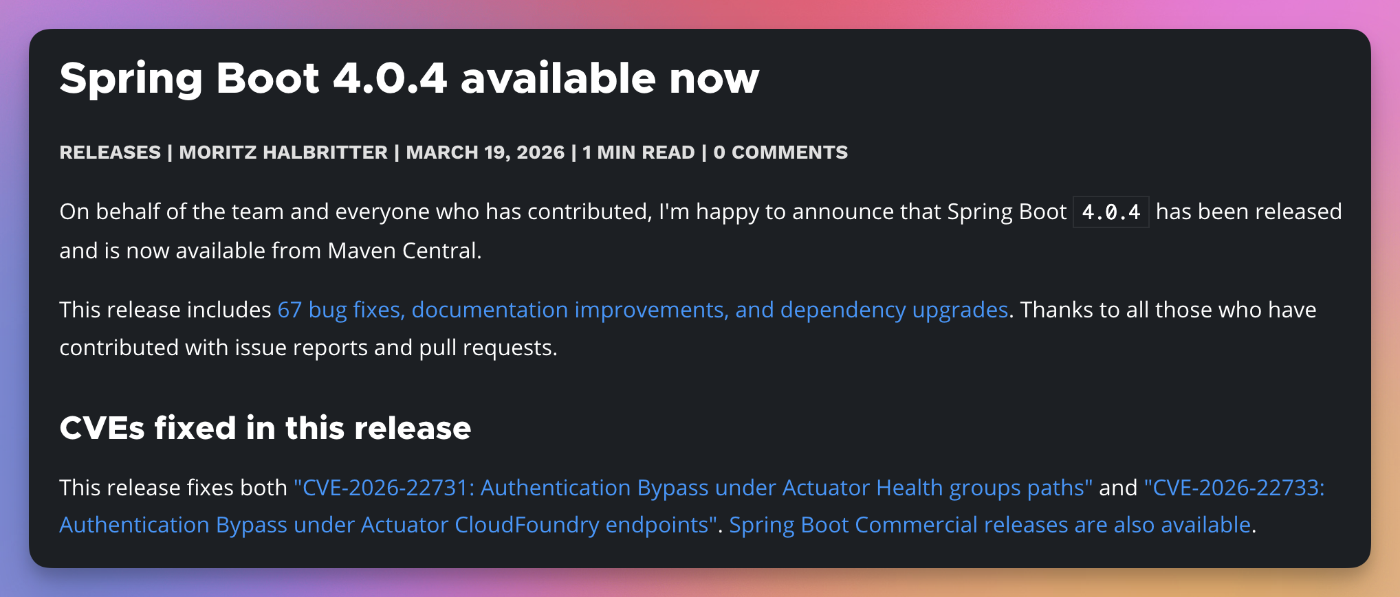 另外还有 67 个 bug 修复,特别是修复了 “CVE-2026-22731: Actuator Health 组路径下的身份验证绕过” 和 “CVE-2026-22733: Actuator CloudFoundry 端点下的身份验证绕过” 等两个安全问题。
