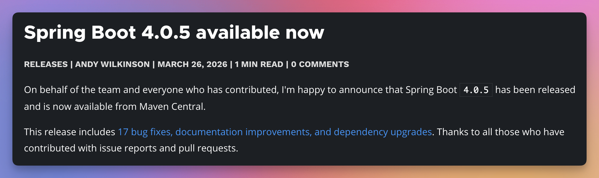 Spring Boot 4.0.5 版本主要包含 17 个漏洞修复、文档改进和依赖升级,重点说说 Spring Boot 4.0.4 版本一些主要的更新要点。