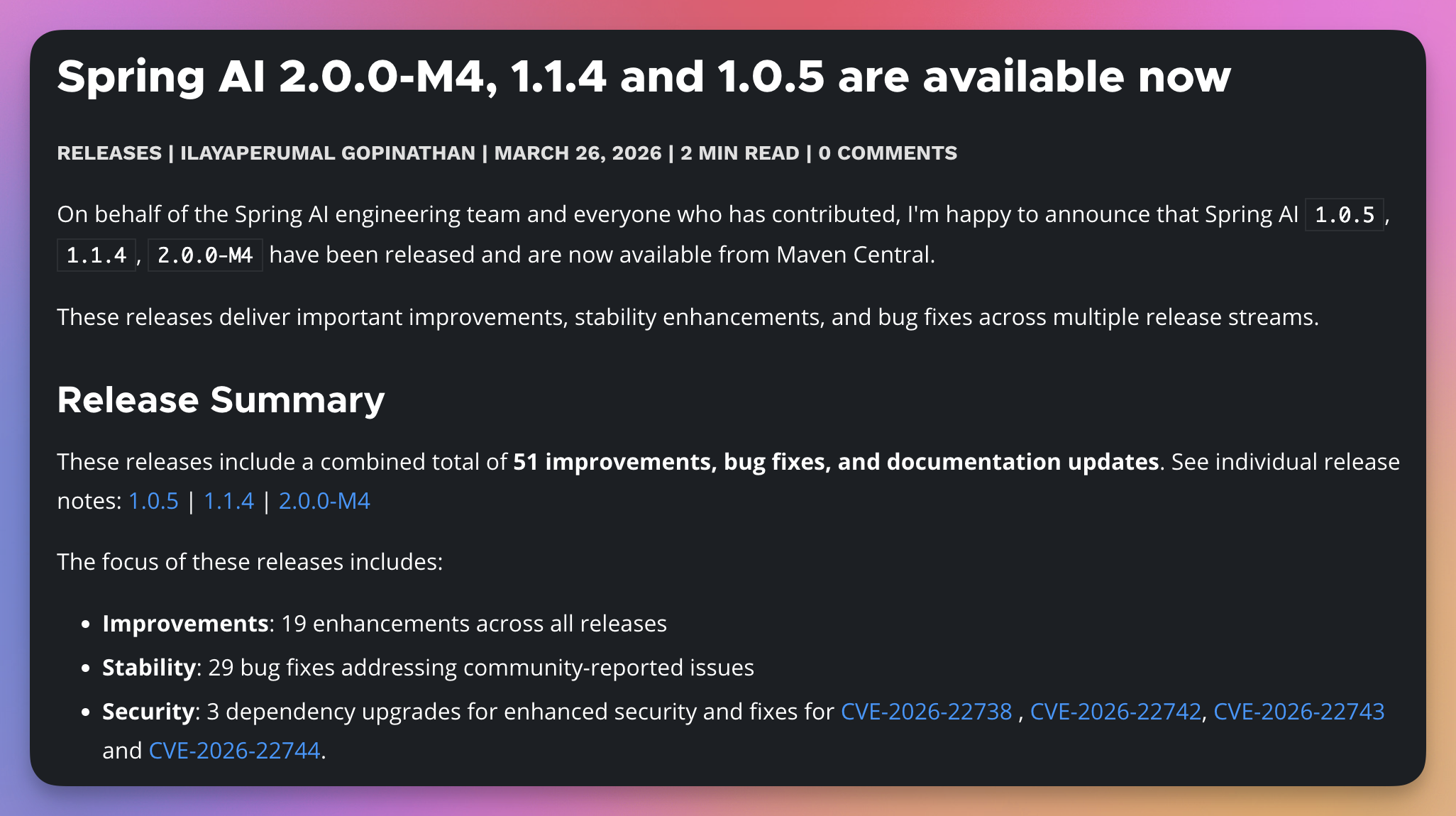 除了 Spring AI 1.1.4,2.0.0 也来到了 M4 版本了,相信再过一阵子就要正式 GA 了,1.0.5 也发布了,大家可以根据自己的需要选择合适的版本。