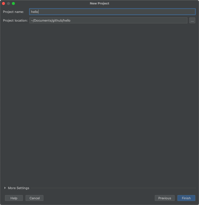 输入Project name,我这里是输入hello。Project location 可以自己修改到想要保存的地方。点击Finish 进入下一步。