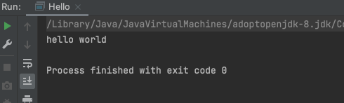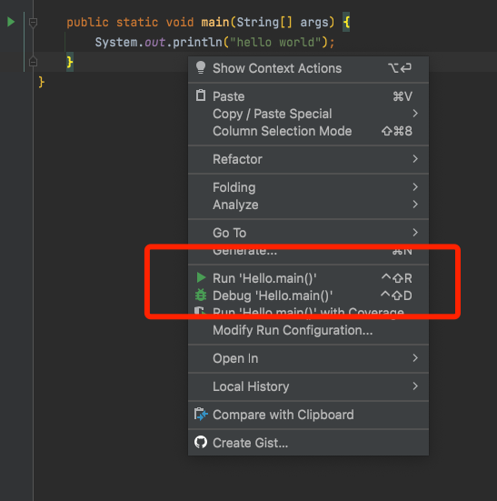 在class 文件内,鼠标右键 选择 Run 'Hello.main()' 执行代码