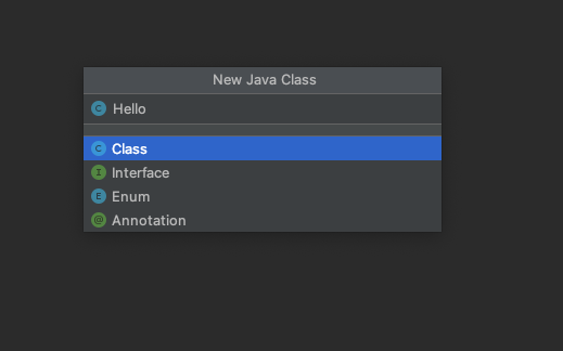 输入Java的名字。 我这里输入的是 Hello,然后按键盘Enter键创建 Hello 类。注意 首字母大写,这是Java的规范,后期会讲到。