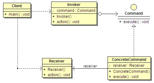 - 请求者对象通过调用action()方法发出请求。如果命令是撤消的,那么ConcreteCommand保存了调用execute()方法之前的状态。