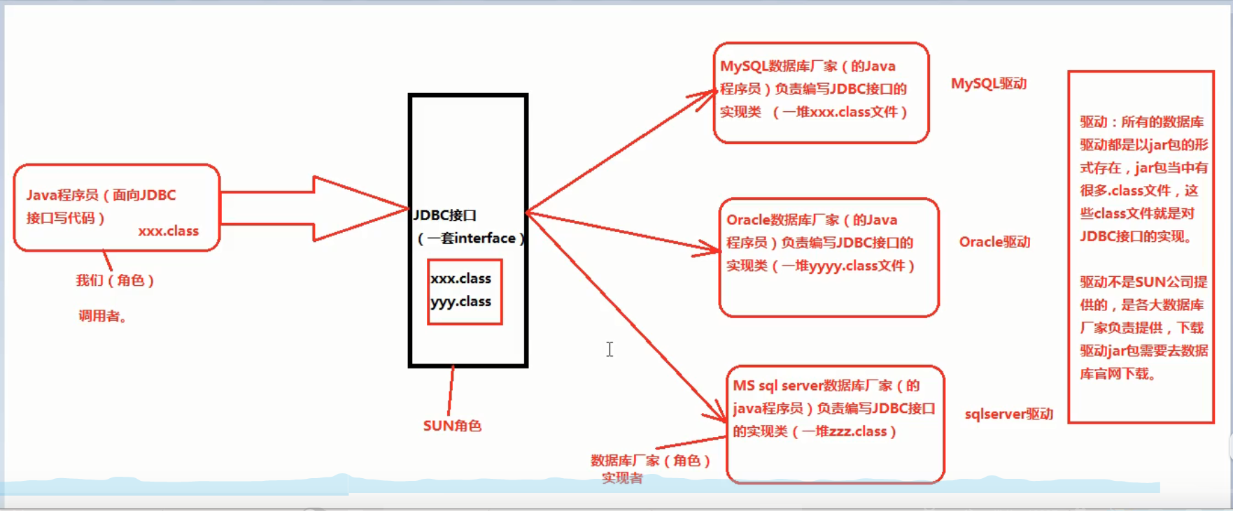 先是SUN公司开发了一套JDBC连接数据库的接口,然后是数据库厂家去实现这个接口,底层去实现自己家不同的代码.我们是需要用哪个数据库直接调用哪个接口实现类就可以了.