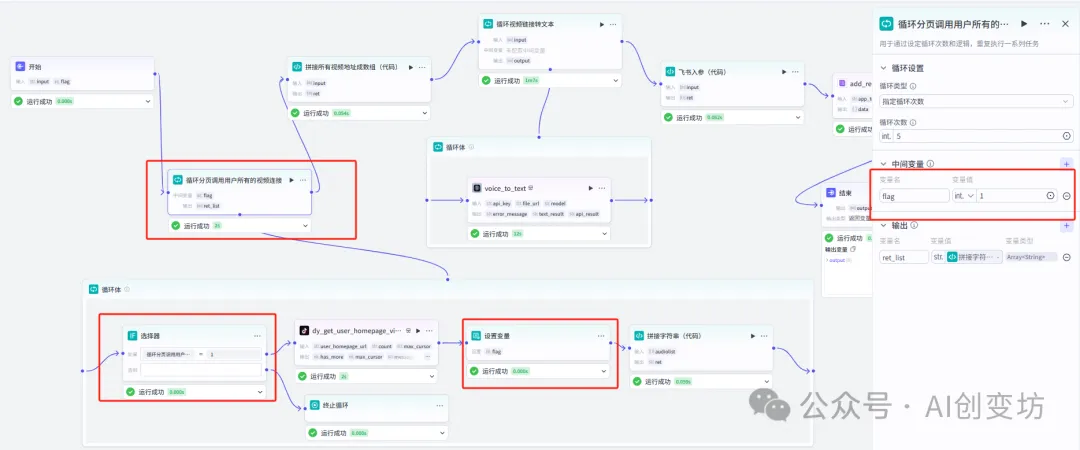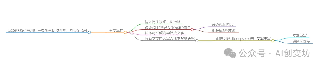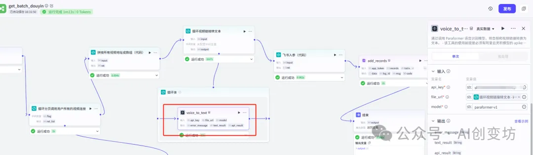 按照上述步骤,最后可以实现,输入抖音博主主页地址,获取所有视频相关内容,进行大模型提取概要,并写入飞书多维表格中。