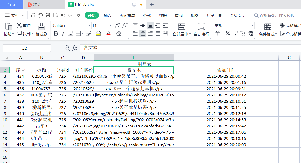 public function test() { $pro = new ProductModel(); $list = $pro->field('id,title,class_id,imgs_url,content,create_time')->selectOrFail(); $xlsName = "用户表"; // 文件名 $xlsCell = [ // 列名 ['id', '序号'], ['title', '标题'], ['class_id', '分类id'], ['imgs_url', '图片路径'], ['content', '富文本'], ['create_time', '添加时间'] ];// 表头信息 $this->downloadExcel($xlsName, $xlsCell, $list);// 传递参数 }