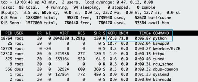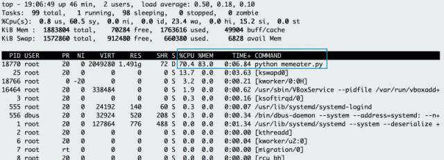 你的应用是否真的内存不足?要确认这个问题,可使用 top 来查看应用程序消耗多少 CPU 和内存。当使用 top 命令后,您注意到一个 Python 应用程序使用了大部分的 CPU,其内存使用量也迅速攀升。当它运行时,如果进程是你的应用程序,则按"C"键来查看完整命令并进行逆向工程。发现原来是你的内存密集型应用程序(memeater.py)。当你的应用程序已经用尽内存,系统会杀掉它并返回一个内存不足(OOM)的错误。