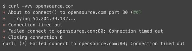 iptables 用于阻止或允许 Linux 主机上的流量,用于 IP 包过滤器管理,类似于网络防火墙。此工具可阻止某些应用程序接收或发送请求。更具体地说,如果您的应用程序难以访问另一个端点,可能已被 iptables 拒绝流量访问该端点。例如,假设您的应用程序的主机无法访问 Opensource.com,您使用 curl 来测试连接。