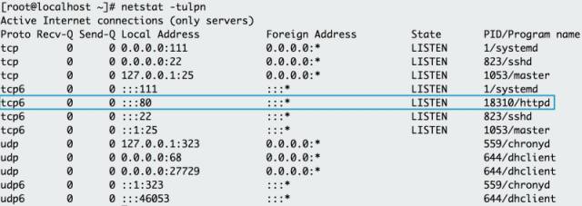 netstat 用于显示网络状态信息。该命令可显示正在使用的网络端口及其传入连接。但是,netstat 在 Linux 中不能开箱即用。如果需要安装它,需要在 net-tools 包中找到它。作为在本地进行试验或将应用程序推送到主机的开发者,可能会收到端口已被分配或地址已被使用的错误。使用 netstat 得到协议、进程和端口这些信息,下图表明 Apache HTTP 服务器已经在下面的主机上使用了 80 端口。
